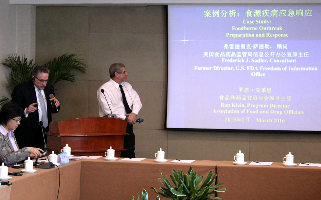 短暂的午餐之后,研讨会进入第三单元“案例分析与制度建构”,由罗彬先生主持。首先,弗雷德·萨德勒和罗恩·克莱因联合报告了“案例分析:食源疾病应急响应”。两位报告人以美国2015年爆发的“绿叶蔬菜李斯特菌”出发,分别介绍了美国食品安全监管多方主体的协调合作、食品召回等制度。之后,来自中国的四位专家学者分别发言。北京市食品药品监督管理局法规处冀玮处长着重介绍了我国食品安全法律责任制度;北京金朔律师事务所张学明主任从职业打假人的现状和原因出发,反思我国食品安全信息公开存在的问题,就如何改变职业打假人现状提出了可行之径;中国人民大学农业与农村发展学院李佳洁博士梳理了我国食品安全追溯制度的历史和现状、存在的问题,探讨了我国食品安全追溯制度构建;最后,高秦伟教授从食品安全监管组织的发展和改革探讨了食品安全监管中的央地协调,就其中存在的问题同与会专家学者进行交流。