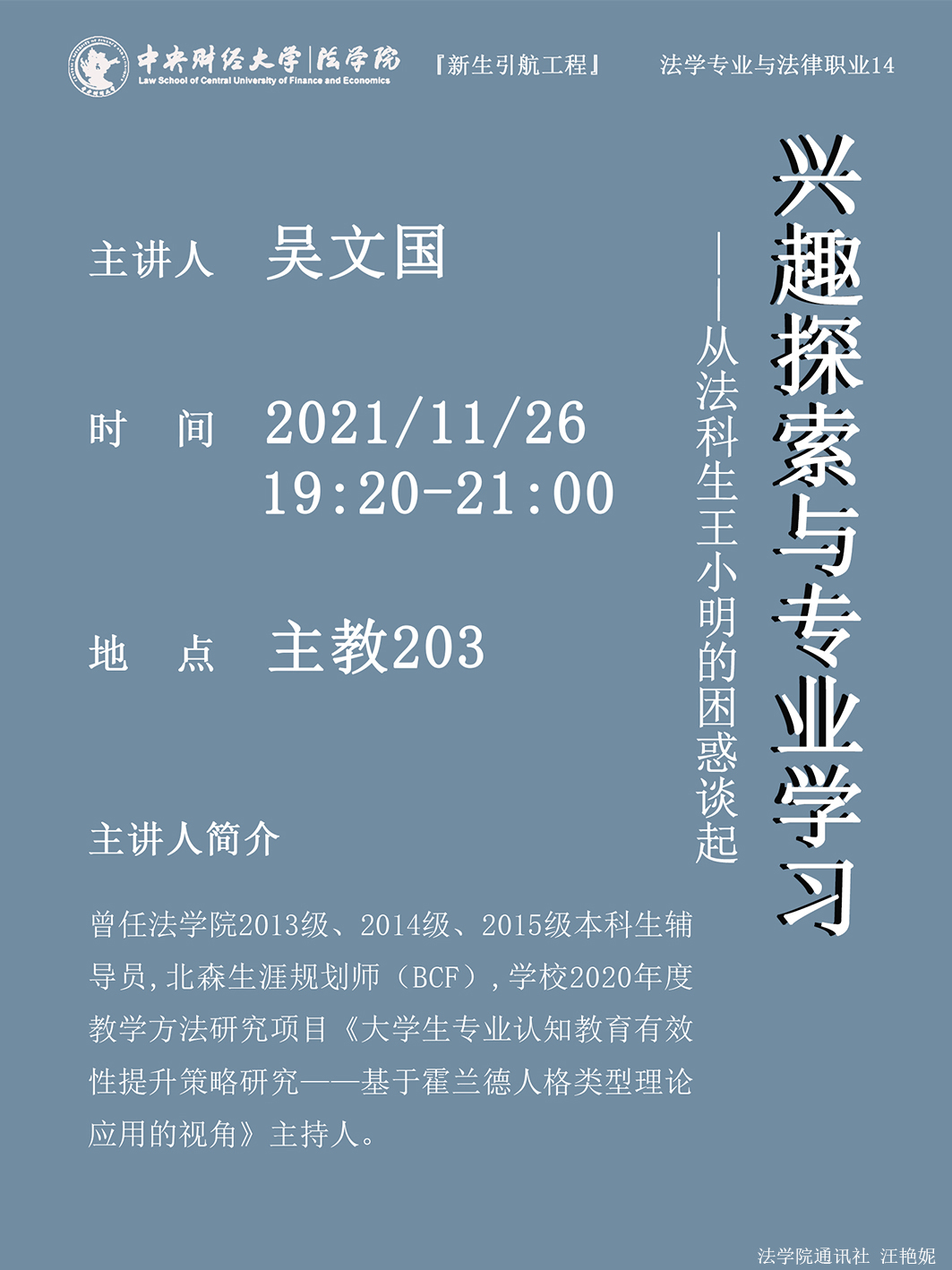 • 讲座|11.26|吴文国:兴趣探索与专业学习——从法科生王小明的困惑谈起