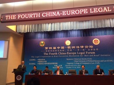 2016年10月15日至16日,第四届“中国-欧洲法律论坛”在中国政法大学学院路校区学术讲堂隆重举行。本次论坛由中国法学会和中国政法大学联合举办,论坛主体题是“创新风险防范机制,引领‘一带一路’法律合作”。浦京集团官网副院长王克玉副教授应邀出席会议,并做论坛发言。