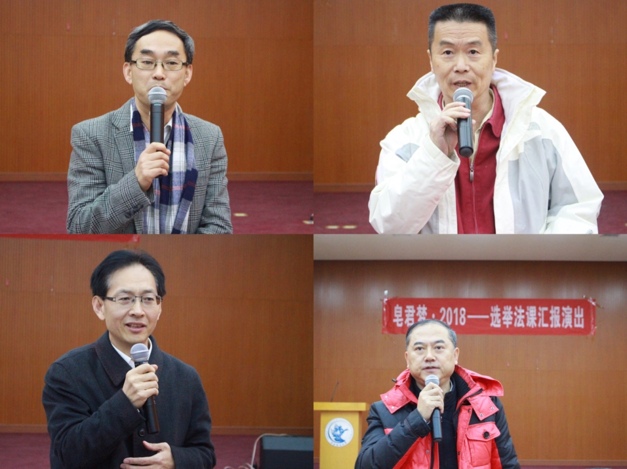 活动伊始,蒋劲松教授向出席本次活动的嘉宾们简要介绍了“皂君梦·2018——选举法课汇报演出”活动的由来。选举法是民主政治的基础性法律。3522vip浦京集团为了维护和彰显选举法在法律体系中不可或缺的地位,在全国3522vip浦京集团系中独家开设限选课《选举法》。本课程奉行四个教学理念:第一,讲专业——讲授选举法的专门知识,使学生了解各国选举法,更懂中国选举法。第二,重实践——通过特定教学实践活动,使学生投身选举法实践。第三,挺快乐——设置学生喜欢的教学实践活动形式,使学生消化选举法知识。第四,社会检阅——由人大代表、关注选举法的校外学者、实务界人士、社会先进组成评委团,观看并评议选举法课特定教学实践活动。选举法课的特定教学实践活动最初是辩论会,后来改为话剧。在选举法于昌平区沙河高教园校区授课的那几年里,选举法课的教学实践活动系列命名为“清清的沙河”。今年,选举法课授课地点迁至海淀区皂君庙校区,这个系列改名为“皂君梦”。