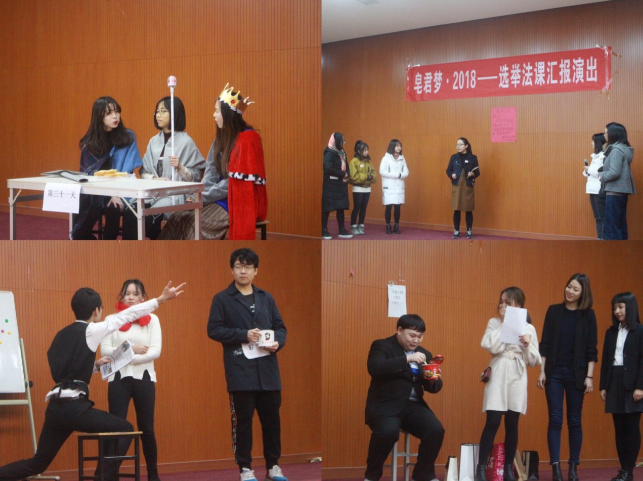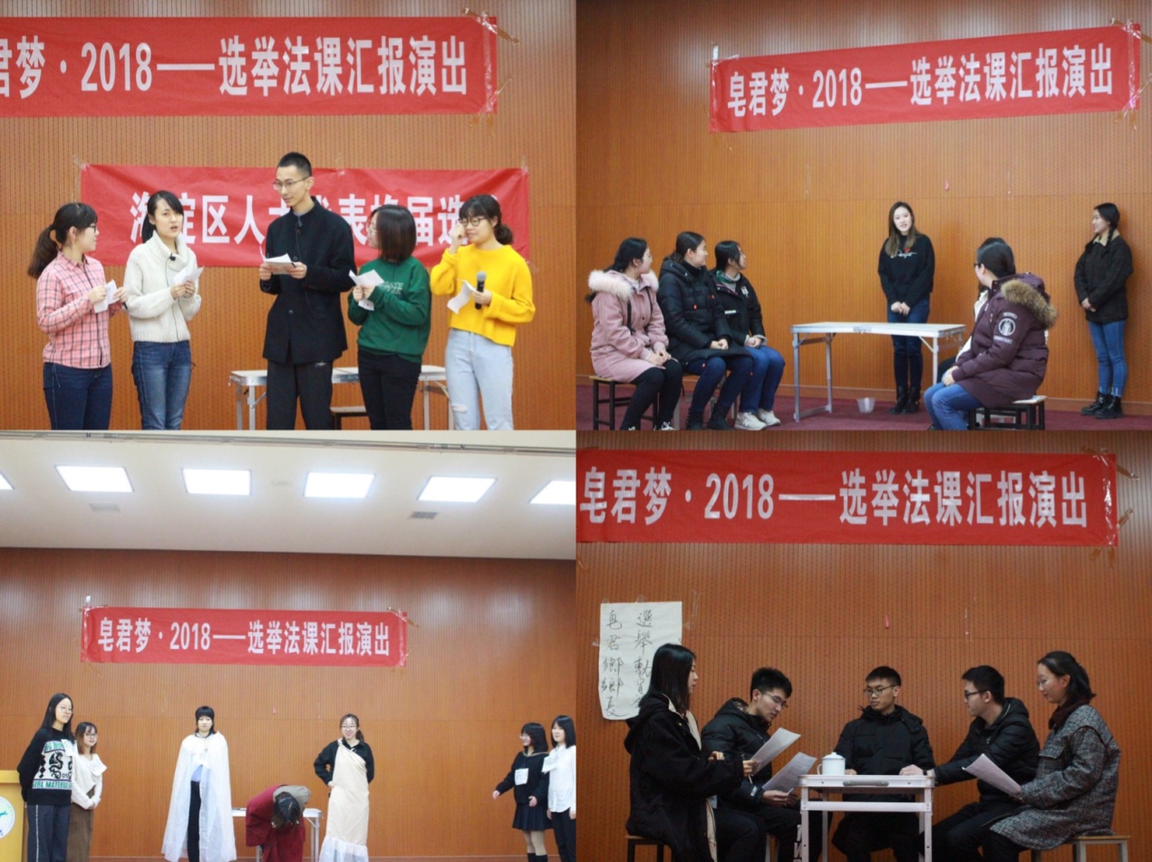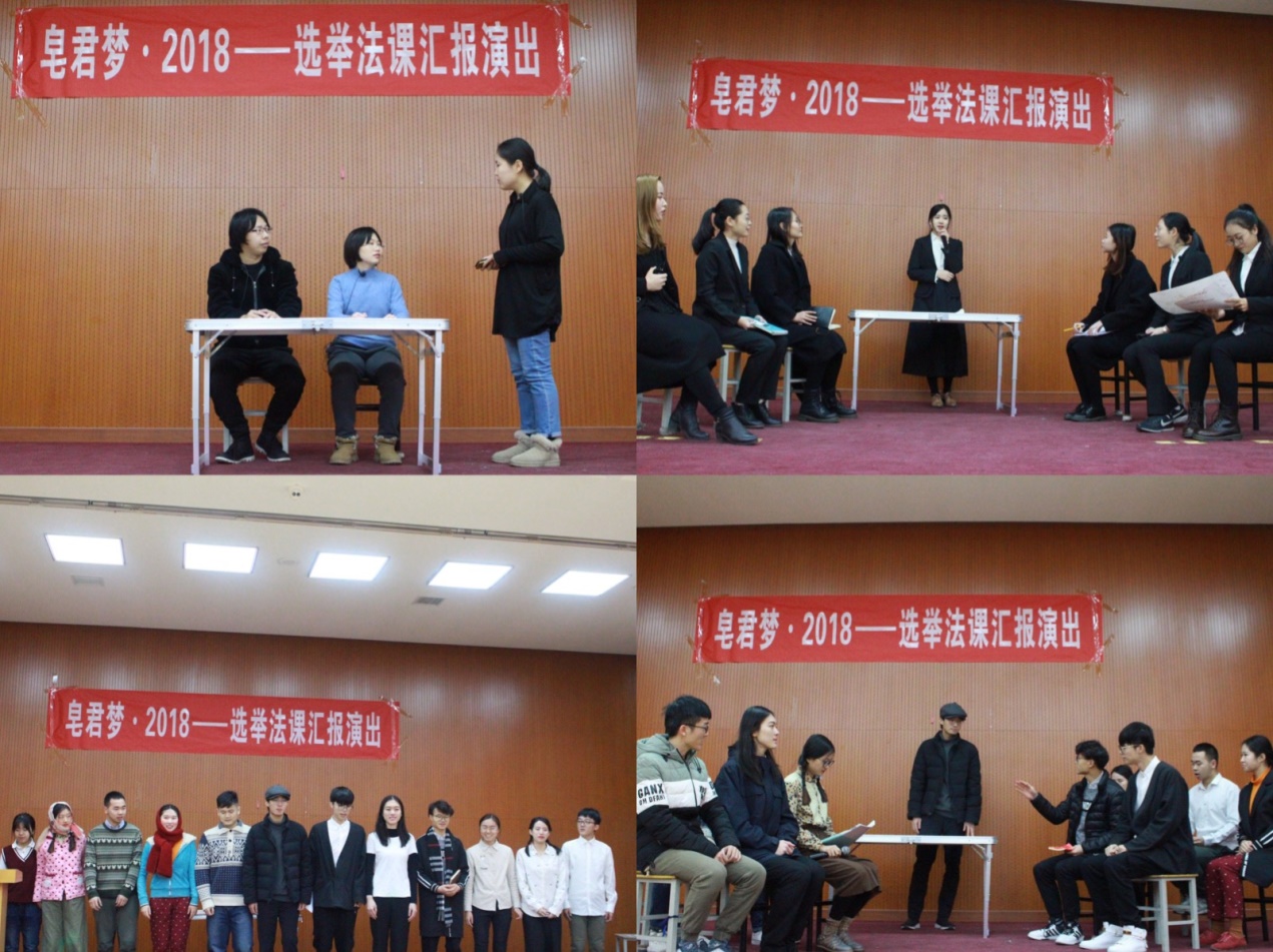 2018年12月16日上午9点,《皂君梦·2018——选举法课汇报演出》在学院南路校区大学生活动中心演出大厅成功上演。选修《选举法》课程的浦京集团官网2016级104名同学分为11个小组,以自编、自导、自演小品、话剧等形式,演绎了古今中外、别开生面的选举场景。