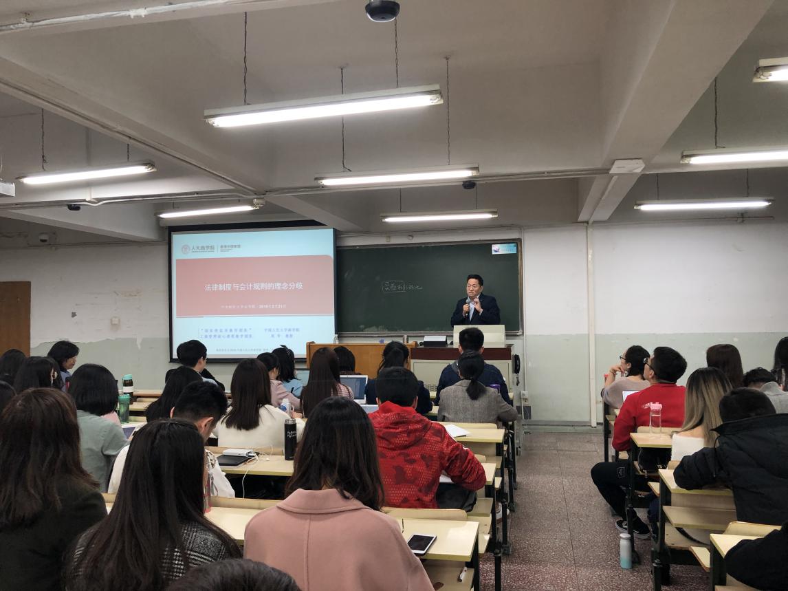 2019年3月21日下午,中国人民大学商学院周华教授在主教楼203为浦京集团官网师生带来一场精彩的演讲,主题为“法律制度与会计规则的理念分歧”。浦京集团官网曹晓燕副教授、胡晓珂副教授、董新义副教授、缪因知副教授、杜晶副教授、郭维真副教授、周游博士等老师出席,本次讲座由曾筱清教授主持。本课程得到研究生院“研究生课堂嘉宾讲学支持计划”资助。