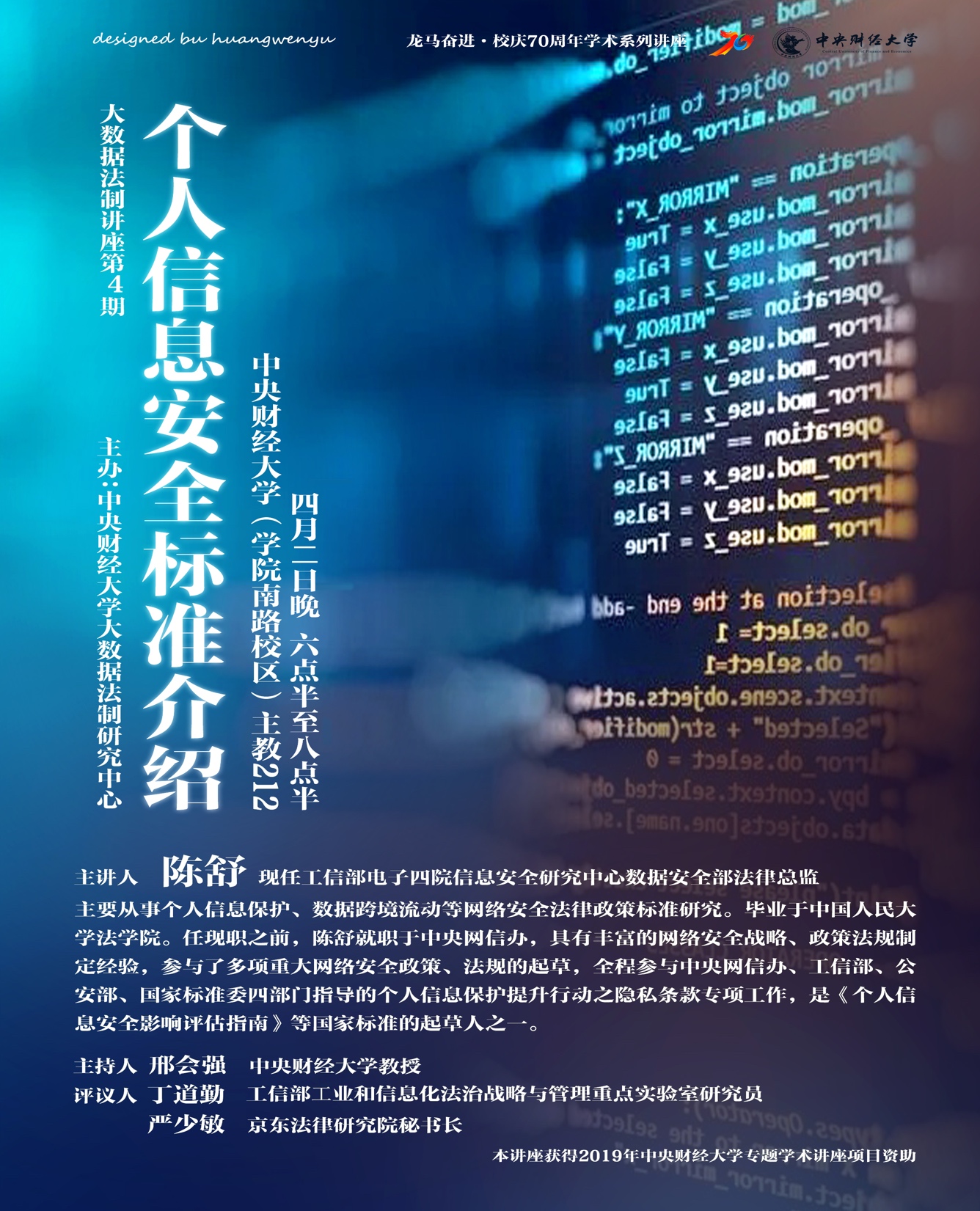 2019年4月2日傍晚,工信部电子四院信息安全研究中心数据安全部法律总监陈舒做客浦京集团官网,根据其丰富的实务经验和扎实的理论功底在第4期大数据法制讲座上带来了题目为"个人信息保护标准介绍”的专题讲座。