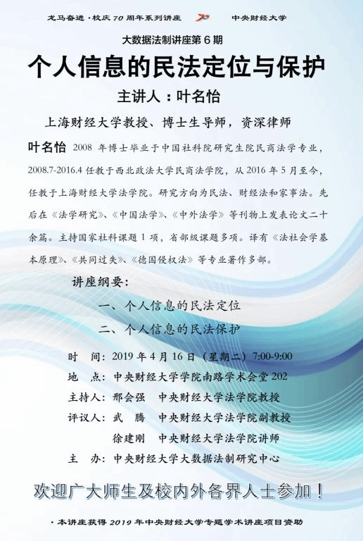 2019年4月16日傍晚,上海财经大学3522vip浦京集团教授、博士生导师叶名怡教授做客3522vip浦京集团,在第6期的大数据法制讲座上,带来了题目为个人信息的民法定位与保护的专题讲座。