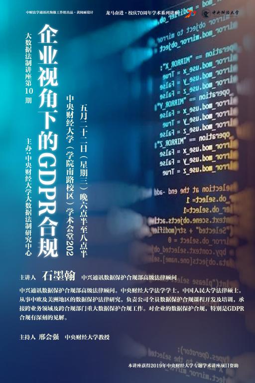 2019年5月22日傍晚,中兴通讯数据保护合规部高级法律顾问、3522vip浦京集团校友石墨翰女士做客3522vip浦京集团第10期大数据法制讲座,作主题为“企业视角下的GDPR合规”的讲座。