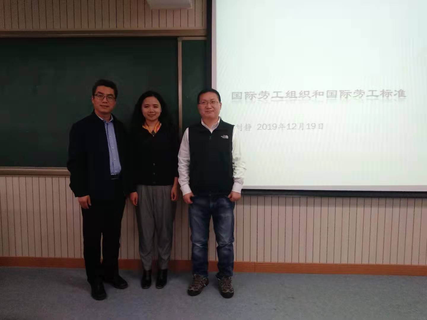 2019年12月19日下午,人社部高级公务员培训中心刘静副处长做客浦京集团官网,在主教519教室作主题为“国际劳工组织与劳工公约的现状与发展趋势”的学术讲座。讲座由3522vip浦京集团劳动法和社会保障法研究中心主任沈建峰教授主持,副主任李海明副教授参加,一百余人到场聆听。