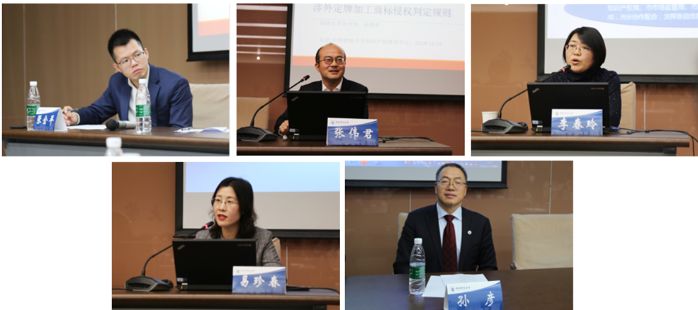 随后,研讨会进入专题二“商标权保护的热点问题探讨”环节,由3522vip浦京集团知识产权研究中心研究员张金平老师主持。同济大学3522vip浦京集团张伟君教授的发言主题为“涉外定牌加工商标侵权判定规则”,他对目前我国司法实践中涉外定牌加工商标侵权判断所适用的四个规则进行了介绍,认为定牌加工涉嫌侵权的行为与授权侵权行为相吻合。北京市知识产权局政策法规处李春玲处长从管理和实践的角度分享了北京市商标管理与保护工作的现状与取得的成果。北京市石景山区人民法院知识产权庭易珍春庭长首先对石景山法院商标权案件的有关情况作了介绍,并通过对司法实践中发现的三个新问题的讲述,包括注册商标专用权与著作权等在先权利冲突的问题、商标法与反不正当竞争法衔接问题、商标法适用问题,探析了商标权的司法保护问题。北京知识产权法研究会商标法专业委员会主任、北京市天元律师事务所合伙人孙彦律师以拍客商标侵权案为例,对“描述性使用”在商标侵权中的抗辩问题进行了深入分析。