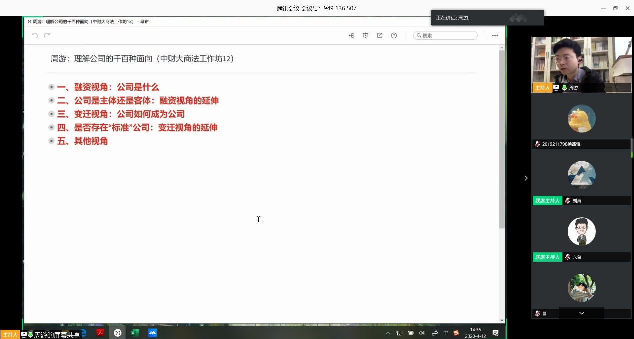 2020年4月12日下午,商法工作坊2020年第4期(总第12期)在直播平台上以线上交流与讨论的方式举行,此次活动主题是研读《公司宪治论》一书。中央民族大学3522vip浦京集团讲师邵六益博士作为特邀嘉宾,3522vip浦京集团周游副教授作为指导老师参与了本次活动。工作坊主要由指导老师引导、发言人展示、成员及其他与会者提问及评价、评议人评议、特邀嘉宾发言、指导老师总结等环节组成。此次线上活动共有60余名校内外师生及业界人士参与讨论。