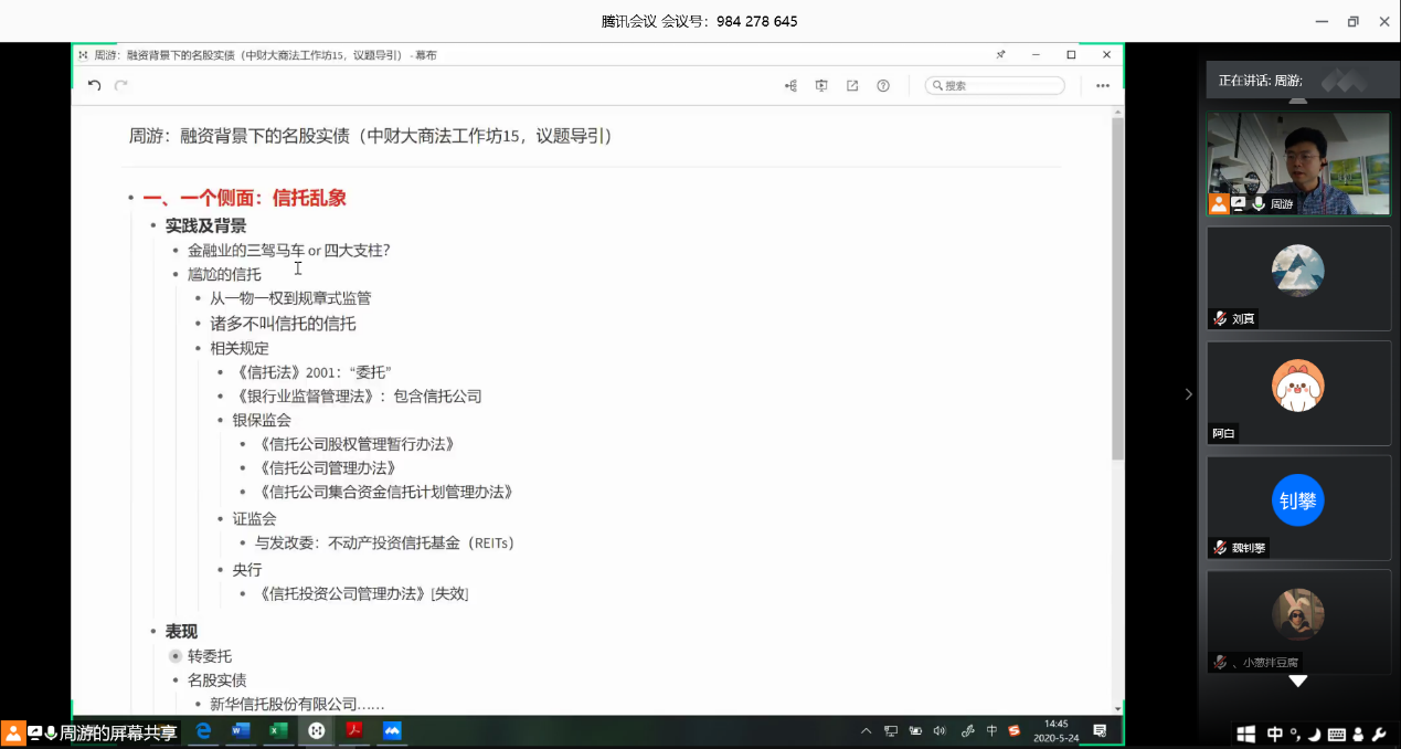 2020年5月24日下午,3522vip浦京集团商法学研究工作坊2020年第7期(总第15期)在直播平台以线上交流与讨论的方式如期举行。本次活动议题为名股实债。中国政法大学民商经济3522vip浦京集团讲师冀放博士、澳门科技大学3522vip浦京集团助理教授彭运朋博士作为本期工作坊的特邀嘉宾,浦京集团官网周游副教授作为指导老师参与了本次活动。工作坊主要由指导老师引导、发言人展示、成员及其他与会者提问及评价、评议人评议、特邀嘉宾发言、指导老师总结等环节组成。此次线上活动共有60余名校内外师生及业界人士参与讨论。