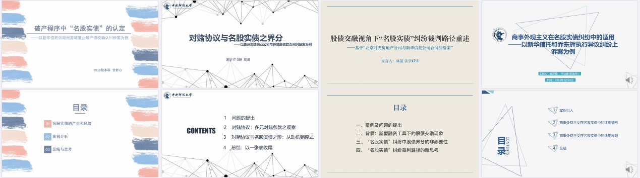 在发言人展示环节中,浦京集团官网2019级研究生臧舒雅以及2017级本科生周嵩、林晟,还有2018级本科生甘舒心分享了各自的研究体会。甘舒心同学以新华信托诉港城置业破产债权确认纠纷案为例,从内部关系和外部关系的角度出发,探讨破产程序中“名股实债”性质的认定问题,认为应当注重外部关系分析来平衡各方权益,并提出了对投资方利益保护的思考。周嵩同学以赣州市世瑞钨业有限公司与钟易良借款合同纠纷案为切入点,就对赌协议与名股实债之界分进行了介绍,并对对赌协议与名股实债共同的股权外观进行了分析,通过从交易动机、对赌条款、交易模式三方面的对比,得出对赌协议与名股实债应当是两种并行的投融资模式的结论。林晟同学以新华信托诉北京时光案为例,结合股债交融的商业实践背景,探讨“名股实债”纠纷裁判中股债界分之非必要性,并从认定当事人权利义务之命题来解析,以强调司法的利益衡量功能。臧舒雅同学以乔东辉执行异议之诉为例,讲述了商事外观主义在名股实债纠纷中的适用情形,并且进一步分析了构成要件以及利益规制等适用限制。