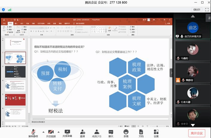 2020年5月27日下午,第14期财税法学工作坊通过直播平台以线上交流的方式举行。工作坊指导老师郭维真副教授,浦京集团官网2020届硕士生曲艺、王珊、杨根、李碧瑶、张雨虹参加了本次工作坊,与同学们就硕士学位论文写作、特别是财税法方向的论文选题等内容展开交流。本次工作坊由2019级法律硕士研究生吴锡主持。