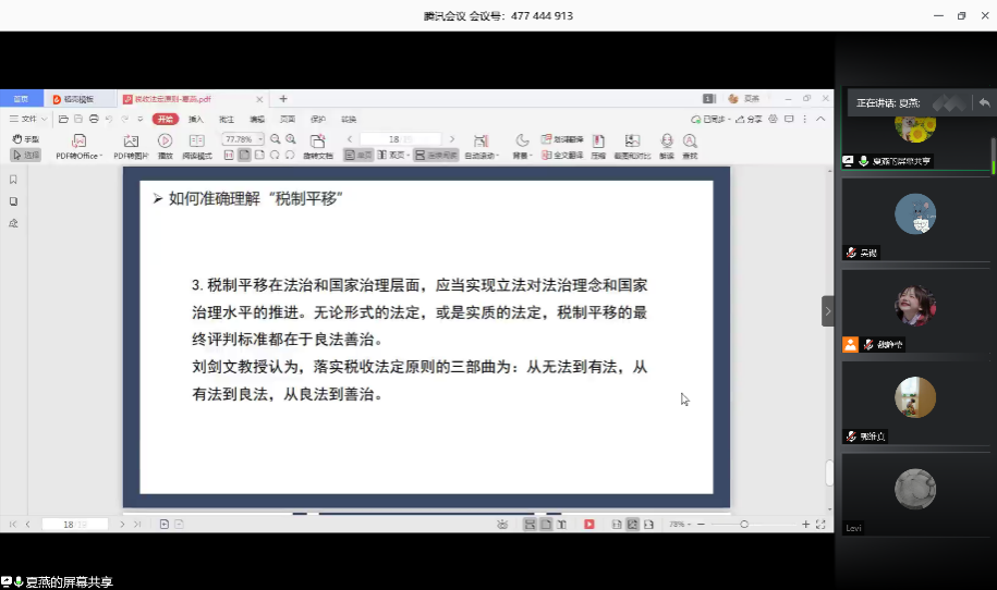 2018级法律硕士研究生夏燕同学对税收法定原则的相关内容进行了分享。夏燕同学从税收法定原则的基本内容和要求入手,对坚持税收法定原则的意义进行了阐释,并对我国税收法定原则的相关法律文本逐条进行了分析。随后她提出,为了保护公民基本权利,理顺立法机关与行政机关、国家与纳税人之间的关系,我国要贯彻落实税收法定原则,这也是推动法治建设的需要。最后,她对目前税收法定实现进程中广泛采用的税制平移提出了自己的看法。