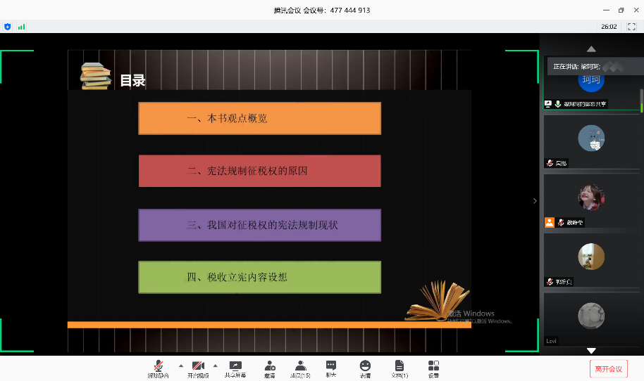 2020年6月20日上午,财税法学工作坊第15期通过直播平台以线上交流的方式举行。本期工作坊为读书分享会,采取“生生互评”模式进行交流与研讨。活动由2019级法律硕士研究生魏静莹主持,指导教师郭维真副教授参加了本次工作坊。