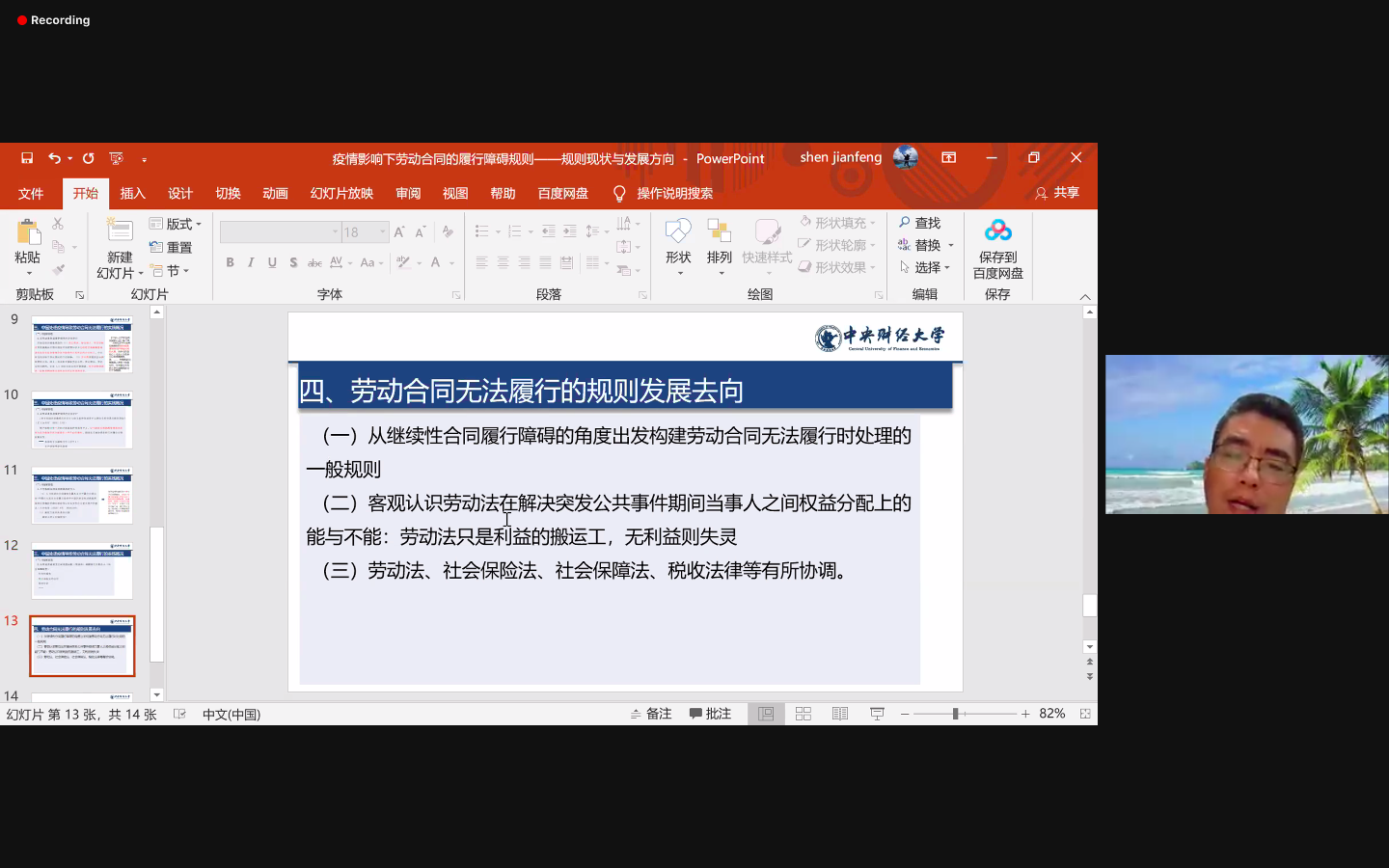 2020年10月17日至18日,由中国社会法学研究会指导,中国政法大学社会法学研究所主办的“中德劳动法与社会保障法对新冠疫情的应对研讨会”在线举行。来自中国、德国、英国、法国等国家和地区的30余名学者应邀参加会议。浦京集团官网沈建峰教授应邀参会并以“因疫情导致劳动合同无法履行时的处理规则——规则、实践与发展去向”为题做会议报告。