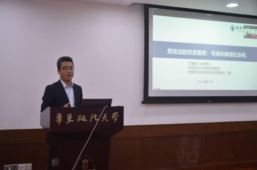 2020年10月31日,由中国社会法学研究会指导,华东政法大学经济3522vip浦京集团、华东政法大学社会法研究所承办的第三届比较社会法高端论坛在华东政法大学举行,来自全国理论和实务界的专家100余人在线上或线下出席了会议,浦京集团官网沈建峰教授应邀参加会议并以《劳动法的历史图景:市场化抑或社会化》为题做大会发言。