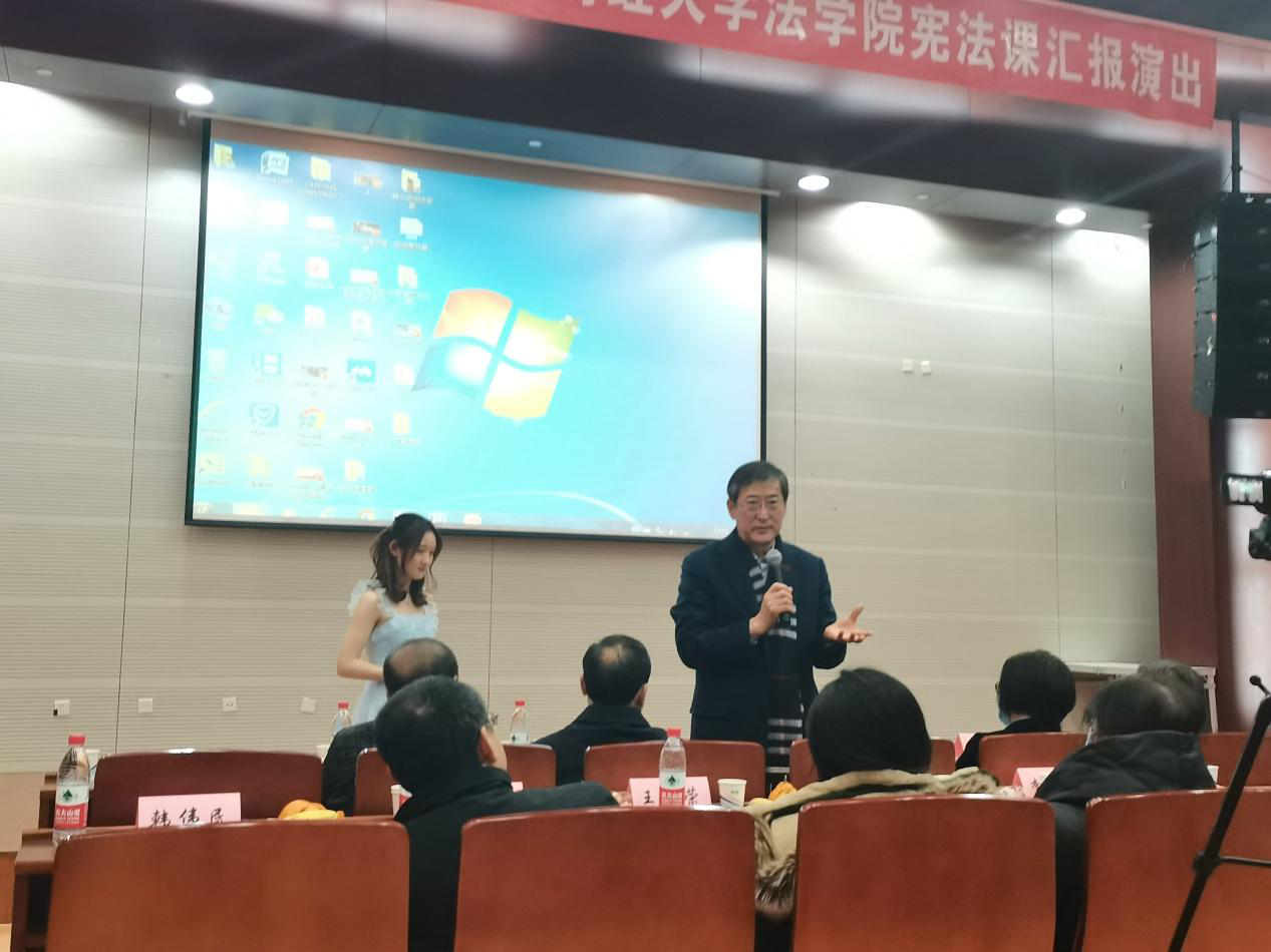 本次汇报演出分为六个环节。首先,《宪法》授课教师蒋劲松教授简话演出来由。蒋教授向大家定义并诠释,学术性(宪法学)系列微话剧“《喷薄·2020》的演出是浦京集团官网学习宪法课的硕士生的非营利性课程实践活动。它将法学与话剧艺术相结合,形成宪法课教学方式的一种改革。蒋教授指出,今年先后发生的中国最先控制住新冠疫情、香港某些高校学生卷入乱港活动、美国政客奥布莱恩和蓬佩奥直接攻击中国宪法所规定的中国共产党领导这些现象有一个共性,即它们都是宪法现象。它们呼唤中国高校的宪法课程从内容到教学形式都作出必要的改革。内容方面,不但讲中外宪法的共通方面,更要彰显中国宪法中的中国特色,借以使中国高校的3522vip浦京集团学生既通各国宪法,更懂中国宪法,爱中国宪法,挺中国宪法中的中国特色。蒋教授认为中国高校宪法教育成功与否的标志不能仅是结课考试拿高分或者通过法律考试,除此之外还应有更高的标准,比方说面对蓬佩奥之辈对中国宪法的攻击,有能力用中国宪法中的中国特色予以迎击。形式方面也要改革。蒋讲授尝试将法学教育与话剧的编导排演嫁接,丰富同学们学习宪法的形式,让同学们学习宪法的过程不再沉闷,而是高兴地学、主动地学,进入情境地学,高频率地学。今天的演出主要是想给校内外领导、社会各界呈现一种态度,即在中国高校一定要着力学好中国宪法中的中国特色,而且学得快乐和昂扬。