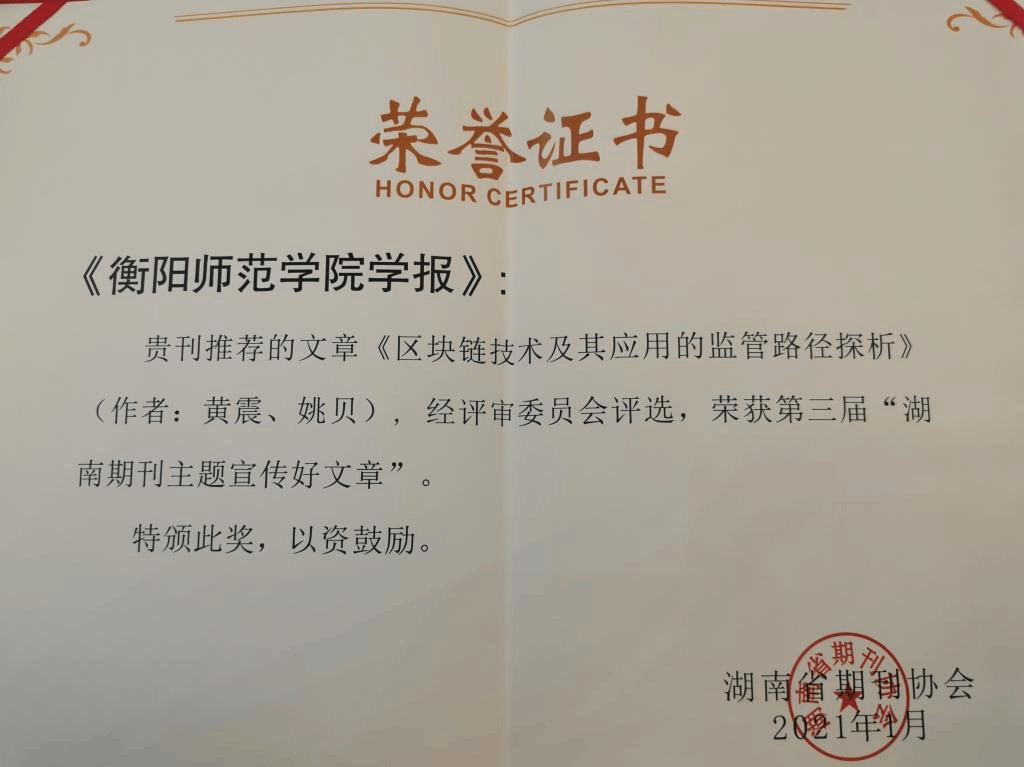近日,第三届“湖南期刊主题宣传好文章”评选结果揭晓,浦京集团官网黄震教授与其19级法律硕士(法学)研究生姚贝在《衡阳师范学院学报》合作文章《区块链技术及其应用的监管路径探析》成功入选,并被推荐参评全国第五届“期刊主题宣传好文章”。