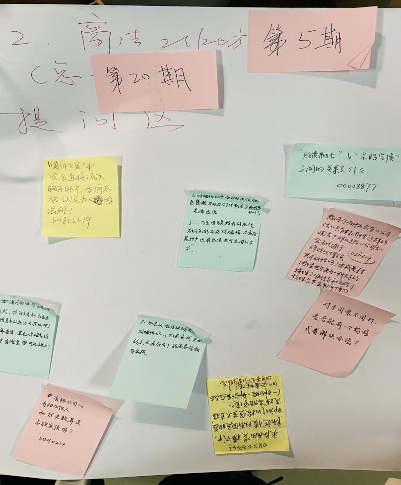 在场的同学对展示的内容进行了思考与讨论,并通过便签的方式对自己感兴趣的部分提出了疑问。