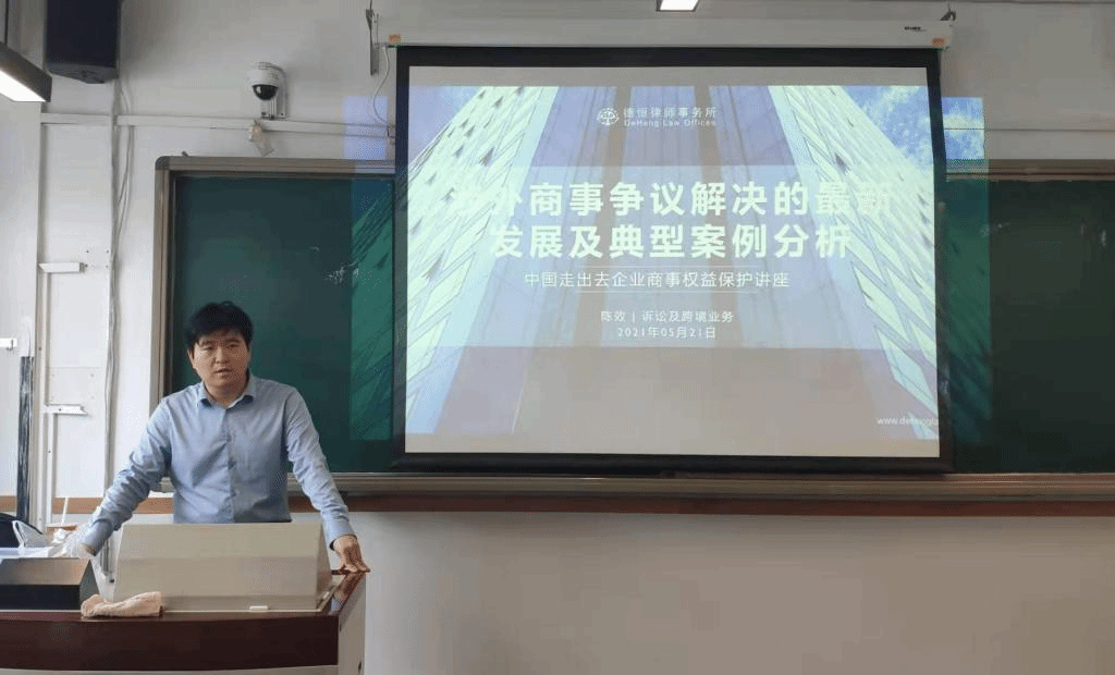 陈效律师首先介绍了自己的从业经历,毕业于美国休斯顿大学获得法律博士学位,目前就职于德恒律师事务所。在美国拥有美国纽约州执业律师资格、美国亚利桑那州执业律师资格,曾在美国律所工作,之后回到国内专注于重大疑难商事诉讼和各类跨境争议业务,在涉外争议解决领域具有较为丰富的经验。然后以《中华人民共和国民事诉讼法》第二百六十五条的规定,及最高人民法院明确北京、上海金融法院具有对境外证券行为损害境内投资人利益诉讼的管辖权为切入点,主要围绕近几年中国涉外商事争议的发展与特点进行讲座。