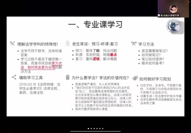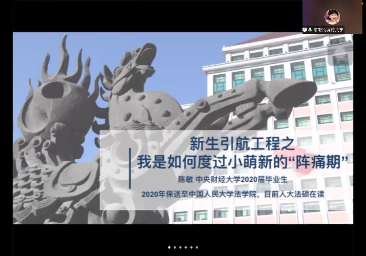 2021年10月30日19点20分,浦京集团官网举办2021级本科生“法学专业与法律职业”课程暨新生引航工程系列讲座。本次主题是“朋辈经验分享之我是如何度过小萌新的‘阵痛期’”,由浦京集团官网2020届本科优秀毕业生陈敏主讲,3522vip浦京集团全体2021级本科生参加。