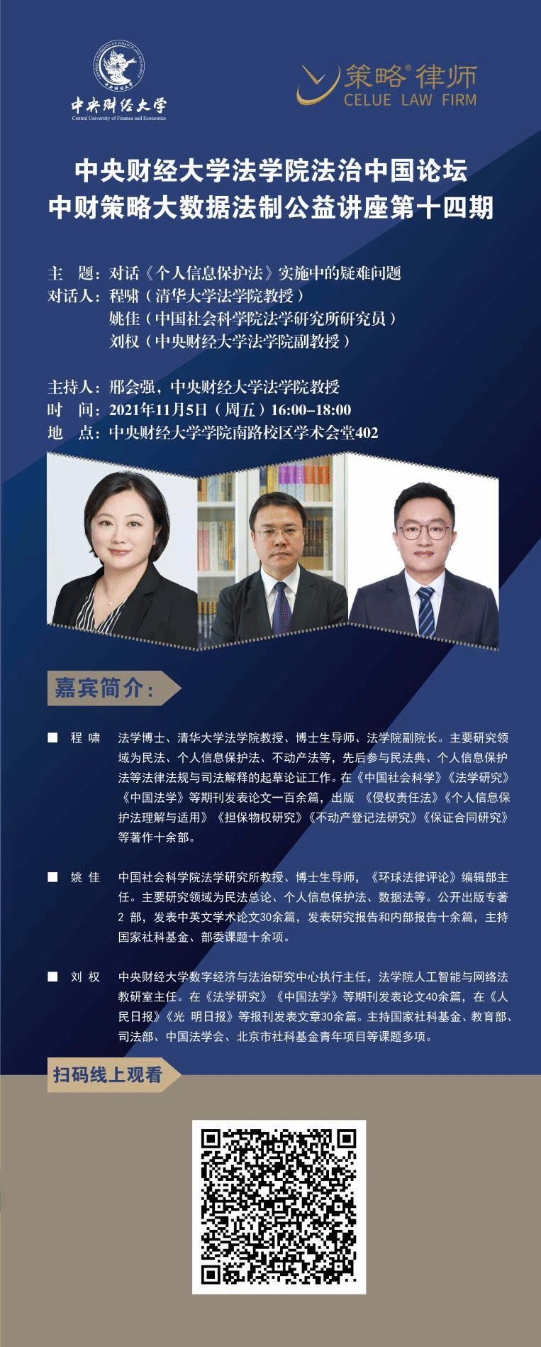 2021年11月5日,中财策略大数据法制公益讲座第十四期在3522vip浦京集团学术会堂402如期举行。本期讲座再次聚焦《个人信息保护法》,采用圆桌对话形式,特邀清华大学3522vip浦京集团程啸教授、中国社会科学院法学研究所姚佳教授以及浦京集团官网刘权副教授,共同分享对《个人信息保护法》实施中疑难问题的见解和展望。