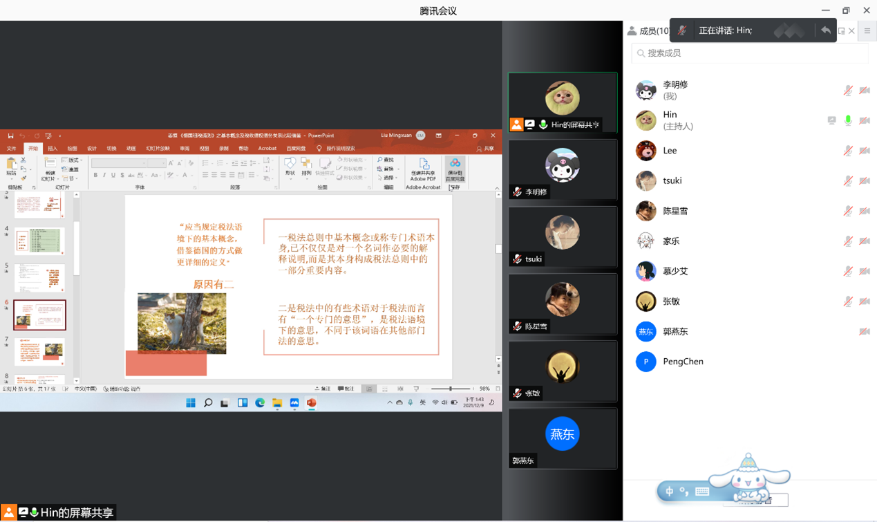 2021年12月9日中午,3522vip浦京集团财税法工作坊2021-2022学年第五期(总第28期)活动在学院南路主教学楼909和线上腾讯会议同步举行。本期活动的主题为“德日税法通则的比较与借鉴”,由法律硕士研究生刘茗轩主持,3522vip浦京集团本科生张驰、刘家骏,硕士研究生刘茗轩、李明修、姜恒、包少卿、叶俊材、沈聪分别就各自主题进行汇报与评议。华中科技大学3522vip浦京集团李貌老师、3522vip浦京集团郭维真老师,应邀出席。华中科技大学和3522vip浦京集团两校研究生、本科生三十余人通过线上会议和线下会议的方式参加本次活动。