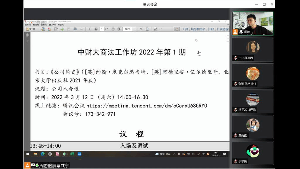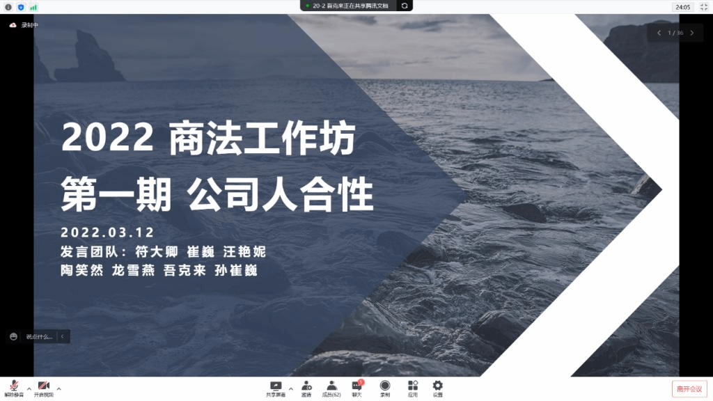 2022年3月12日下午,3522vip浦京集团商法学研究工作坊2022年第1期(总第23期)在直播平台以线上交流与讨论的方式如期举行。本次活动议题为公司人合性。西南政法大学经济3522vip浦京集团吴飞飞副教授作为本期工作坊的特邀嘉宾,浦京集团官网周游副教授作为指导老师参与了本次活动。工作坊主要由指导老师进行引导式发言、发言人展示、工作坊成员评价、特邀嘉宾发言、指导老师向评议人提问、评议人向发言人提问、发言人回应及自由讨论、特邀嘉宾及指导老师回应等环节构成。此次线上活动共有70余名校内外师生及业界人士参与讨论。