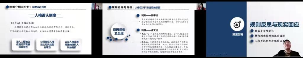 紧接着来到了发言组展示环节,浦京集团官网2021级硕士研究生郭闿钰、2019级本科生王鸿竹、2020级本科生王汉申、徐子渊代表发言组分享了有关人格否认制度主题的相关研究。徐子渊同学先是分享了两个案例,徐工集团工程机械股份有限公司诉成都川交工贸有限责任公司等买卖合同纠纷案和谢某旭与黄某阳、某合公司某佳公司买卖合同纠纷案,利用两则案例引出了本次发言组的主题。第二部分相关规则的介绍和分析由王鸿竹和郭闿钰两名同学共同完成。首先王鸿竹同学从现行《公司法》第20条第3款的条文内容出发,从利益衡量的角度明确了本条的立法目的,之后结合条文所规定的具体要件和行为类型,明确了立法指导司法实践中人格否认的认定标准,并在此基础上反思现有规定的科学性和妥当性。之后由郭闿钰同学结合司法实践现状,介绍了处理横向刺破相关案件时法院的审理思路,其中重点介绍了人格否认制度的扩张适用,对类推适用的合理性进行了分析,并从请求权基础等方面反思了妥当性何在,最后郭闿钰同学探索反思了我国扩张适用人格否认制度的原因。发言的第三部分由王汉申同学进行介绍,他向我们介绍了有限责任以及人格否认的理论来源与基础。他从有限责任从古罗马的起源讲起,论述了有限责任的来源过程以及人格否认对于公司、股东和经济的重要作用。其次,他以数据的形式向我们介绍了中国人格否认刺破面纱的适用困境——刺破率高、刺破案件数量大等问题,结合中国法律规定和司法适用现状,向我们介绍了他所分析的该困境的原因。最后,他结合去年修改的《公司法修改草案》向老师提出了“如何在成文清晰立法与给予法官自由裁量权中寻求平衡”的问题。