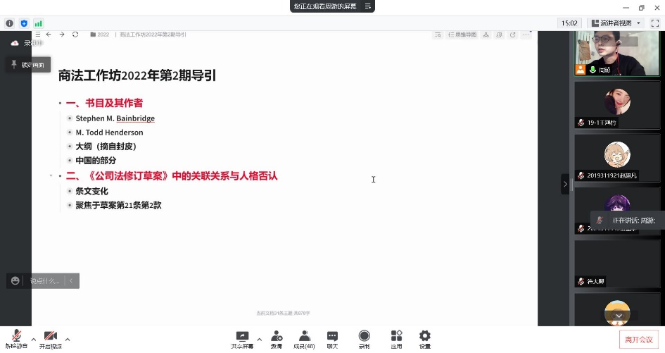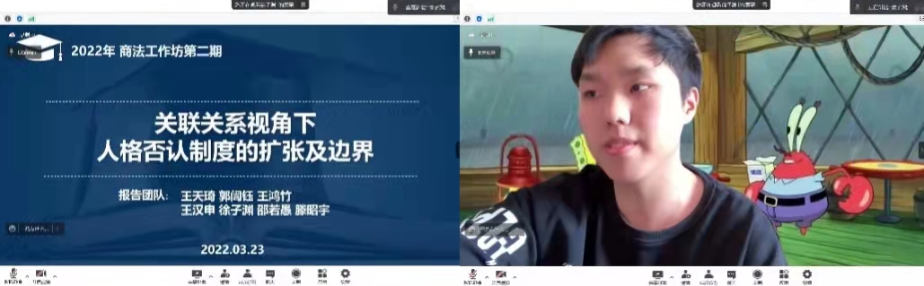 2022年3月26日下午,3522vip浦京集团商法学研究工作坊2022年第2期(总第24期)以腾讯会议为平台,采用线上交流会的形式举办。本次工作坊的主题为“关联关系视角下人格否认制度的扩张及边界”。中国政法大学民商经济3522vip浦京集团师资博士后徐可老师作为本期工作坊的特邀嘉宾,浦京集团官网周游副教授作为指导老师参与了本次活动。工作坊主要由指导老师进行开场介绍与引导、发言团队主题发言、特邀嘉宾发言、指导老师向评议团队提问、评议团队提问发言团队、发言团队回应与自由讨论、特邀嘉宾与指导老师回应成员提问等环节构成。本次线上工作坊共有70余位校内外师生及业界人士参与讨论。