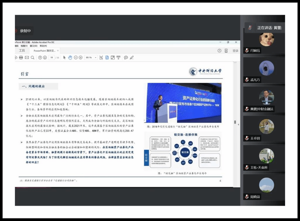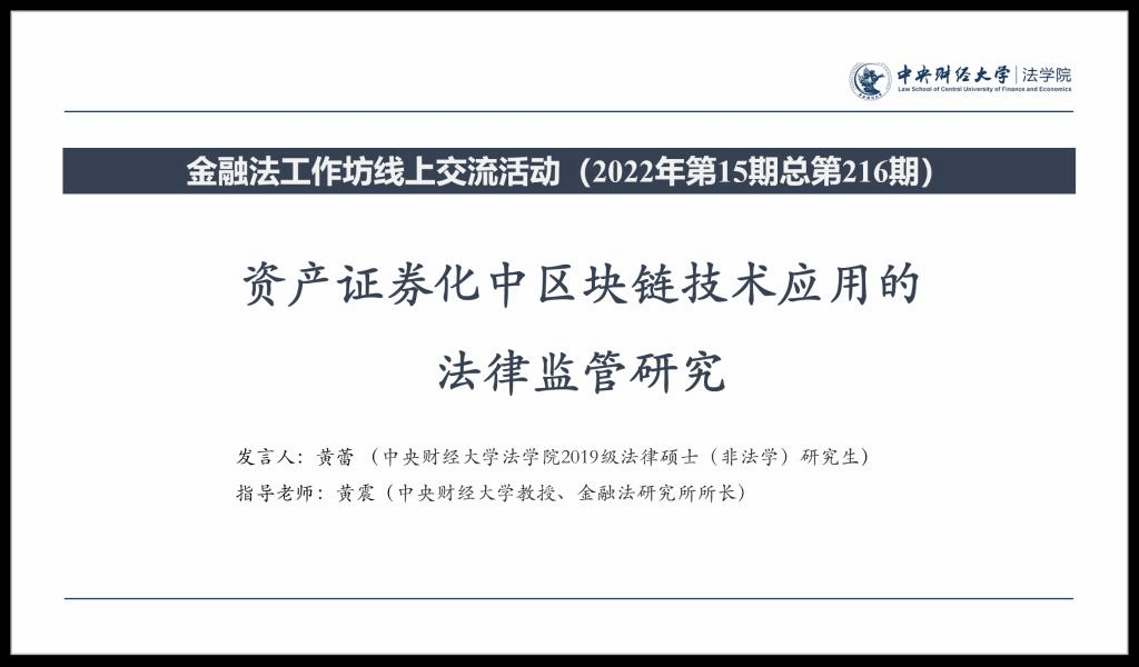 2022年4月16日上午,3522vip浦京集团金融法工作坊2022年第十五期(总第216期)以腾讯会议为平台,采用线上交流的形式举办。本次活动的主题为“资产证券化中区块链技术应用的法律监管研究”。浦京集团官网黄震教授对活动进行了全程指导,也邀请了数位校外的业界人士参会讨论。工作坊主要由主持人介绍,发言人分享,评议人评议,答疑与交流和指导老师点评与总结五大环节构成。