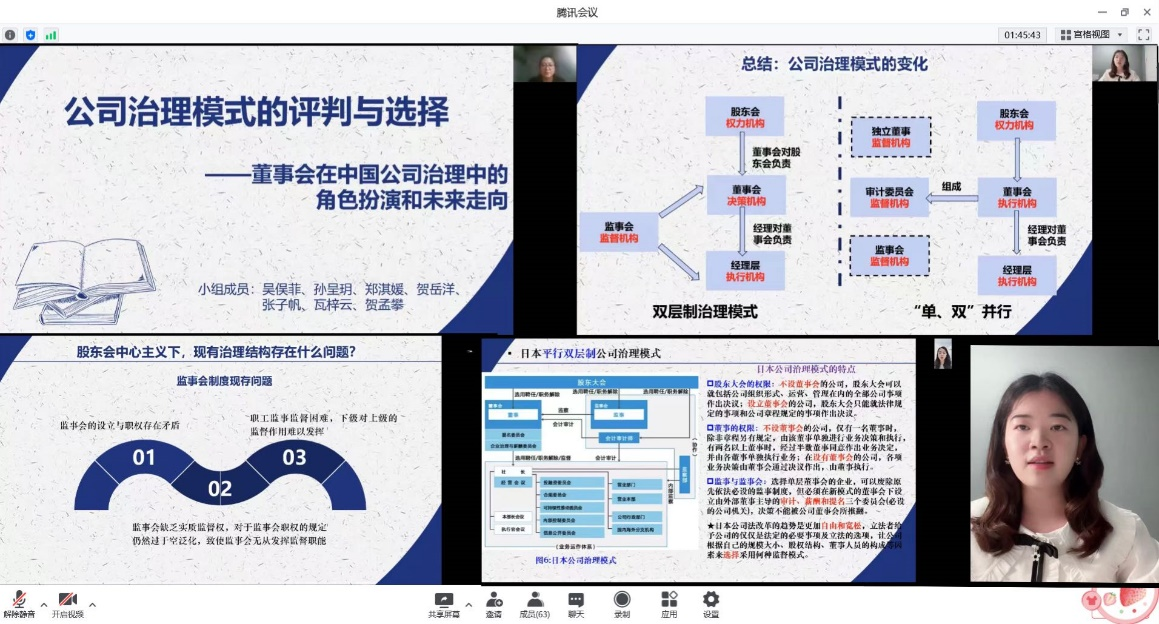 随后进入发言组展示环节,浦京集团官网2021级硕士研究生孙呈玥、2020级本科生张子帆、2019级本科生郑淇媛、2021级硕士研究生吴俣菲代表发言组分享以“公司治理模式的评判和选择——董事会在中国公司治理模式中的角色扮演和未来走向”为主题的相关研究。第一部分,孙呈玥同学通过类案整理和个案分析的方式向大家展示了现阶段我国公司治理模式中董事会存在定位不明,职能混乱等现象,并就此引出我国公司治理模式中董事会应该扮演何种角色等问题。第二部分,张子帆同学以美国、德国和日本三个国家为例介绍了域外国家公司治理的基本模式和主要特点。首先张子帆同学对本期研读书目做简要梳理,后分别介绍美国、德国和日本公司治理模式的特点,通过进行对比分析总结出,日本公司治理结构分为传统监事制和委员会制,而委员会制与美国的单层董事制在股权结构、股东大会和董事会的职权划分以及监督激励机制上都具有高度的相似性,德国的垂直双层制与日本的传统监事制也有一定的相似之处。第三部分由郑淇媛和吴俣菲两位同学共同分享。郑淇媛同学首先通过《公司法》第22条第2款、第37条、第46条的规定介绍了学界对董事会中心主义和股东会中心主义的划分标准。并从董事会和监事会不同制度分析了其现存的问题。随后吴俣菲同学重点向大家展示了《公司法》修改草案的对比部分,总结出董事会中心主义在修订草案中的六点体现,提出我国公司治理模式已由“双层制治理模式”进入到“单、双”并行的模式。最后,吴俣菲同学指出是否能认为我国公司法修订草案确立了董事会中心主义的问题,并引用了周游老师在《从被动填空到主动选择:公司法功能的嬗变》一文中的核心观点进行回答:我国的公司治理模式之路正在从被动填空走向主动选择。