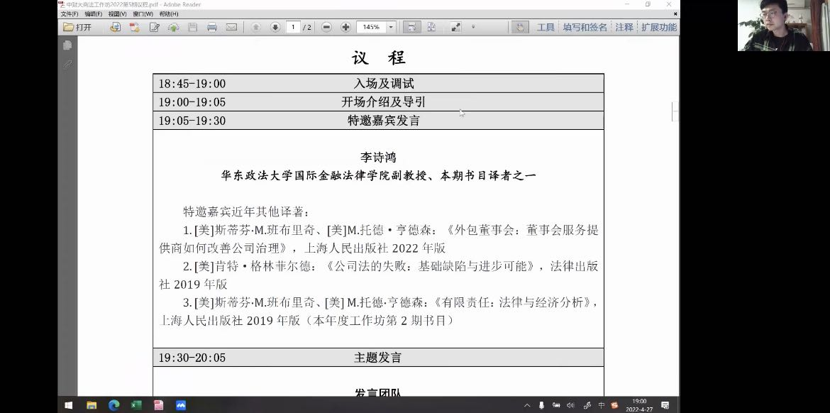 2022年4月27日晚,3522vip浦京集团商法学研究工作坊2022年第五期(总第27期)采用线上交流的形式举办。本次活动的议题为公司治理模式的评判与选择——董事会在中国公司治理模式中的角色扮演和未来走向。本期工作坊参考书目《金融危机后的公司治理》的译者之一、华东政法大学国际金融法律学院副教授李诗鸿老师受邀参加本次活动,浦京集团官网周游副教授对活动进行全程指导。工作坊主要由嘉宾对会议主题进行介绍与拓展、研究团队围绕主题进行展示、指导老师点评、指导老师对评议团队进行提问、评议团队回答提问、评议团队提问发言团队、发言团队回应与自由讨论、特邀嘉宾与指导老师回应成员提问等环节构成。本次线上商法工作坊共计有70余位校内外师生及业界人士参与讨论。