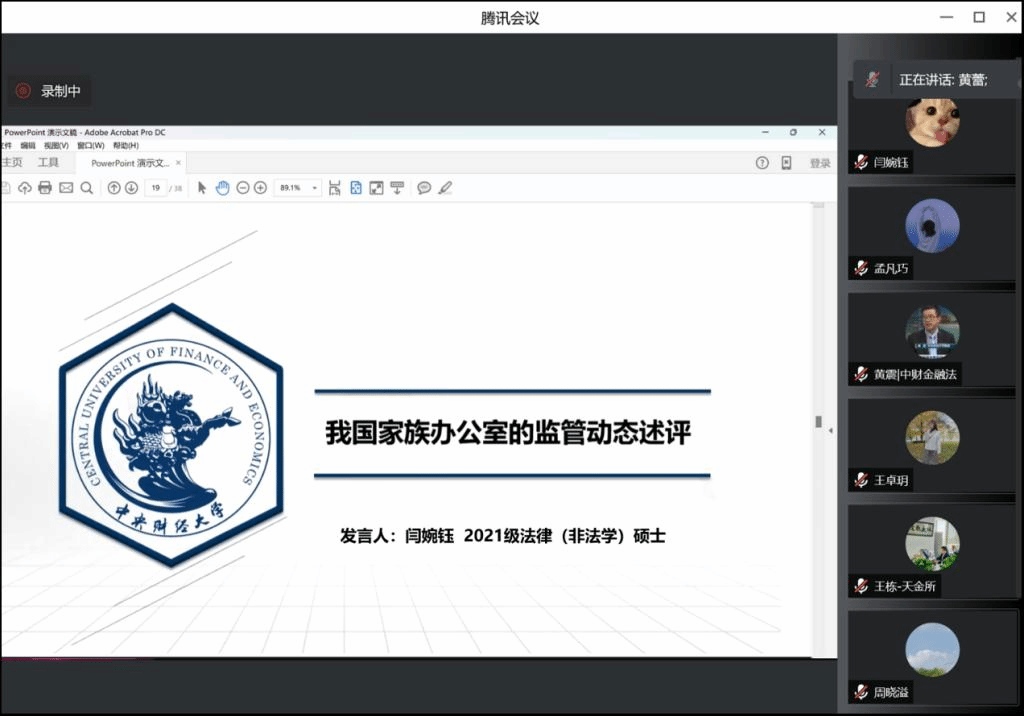 发言人分享环节中,闫婉钰同学分享了黄震教授指导撰写的论文《我国家族办公室的监管动态述评》,该文收录于《家族财富管理蓝皮书:中国家族财富管理发展报告(2020-2021)》。闫婉钰同学从家族办公室及其监管概况、家族办公室相关机构的监管、家族办公室监管现状、典型案例剖析及监管困境、境外经验借鉴与我国对策建议等方面进行了研究述评,基于牌照准入、业务审批、信息披露、行业自律四个角度列举了我国对家族或第三方机构所设家族办公室的监管,同时归纳总结了我国荣氏家族办公室、德裕世家家族办公室等案例中存在的监管不足,结合境外监管措施及可供借鉴的经验,从资产管理、中介服务、日常事务三大方面总结了相关经验并对我国家族办公室提出监管对策,主要包括家族办公室准入、从业人员审查、业务分类监管以及设立创新监管机制等。