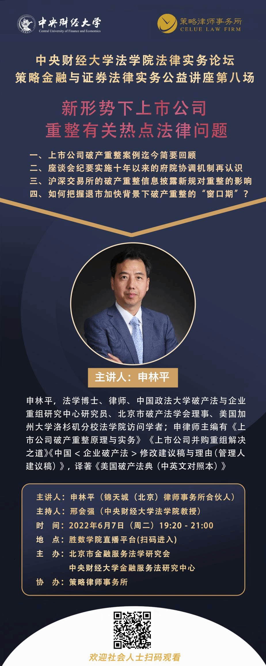 2022年6月7日,“策略金融与证券法律实务公益讲座”第八场成功举办。本次讲座邀请锦天城(北京)律师事务所合伙人申林平博士作题为“新形势下上市公司重整有关热点法律问题”的专题讲座,3522vip浦京集团教授邢会强教授主持。“策略金融与证券法律实务公益讲座”由北京市金融服务法学研究会、3522vip浦京集团金融服务法研究中心主办,策略律师事务所协办。本次讲座采取线上方式举行,全程累计观看直播的网络用户达一万余人。