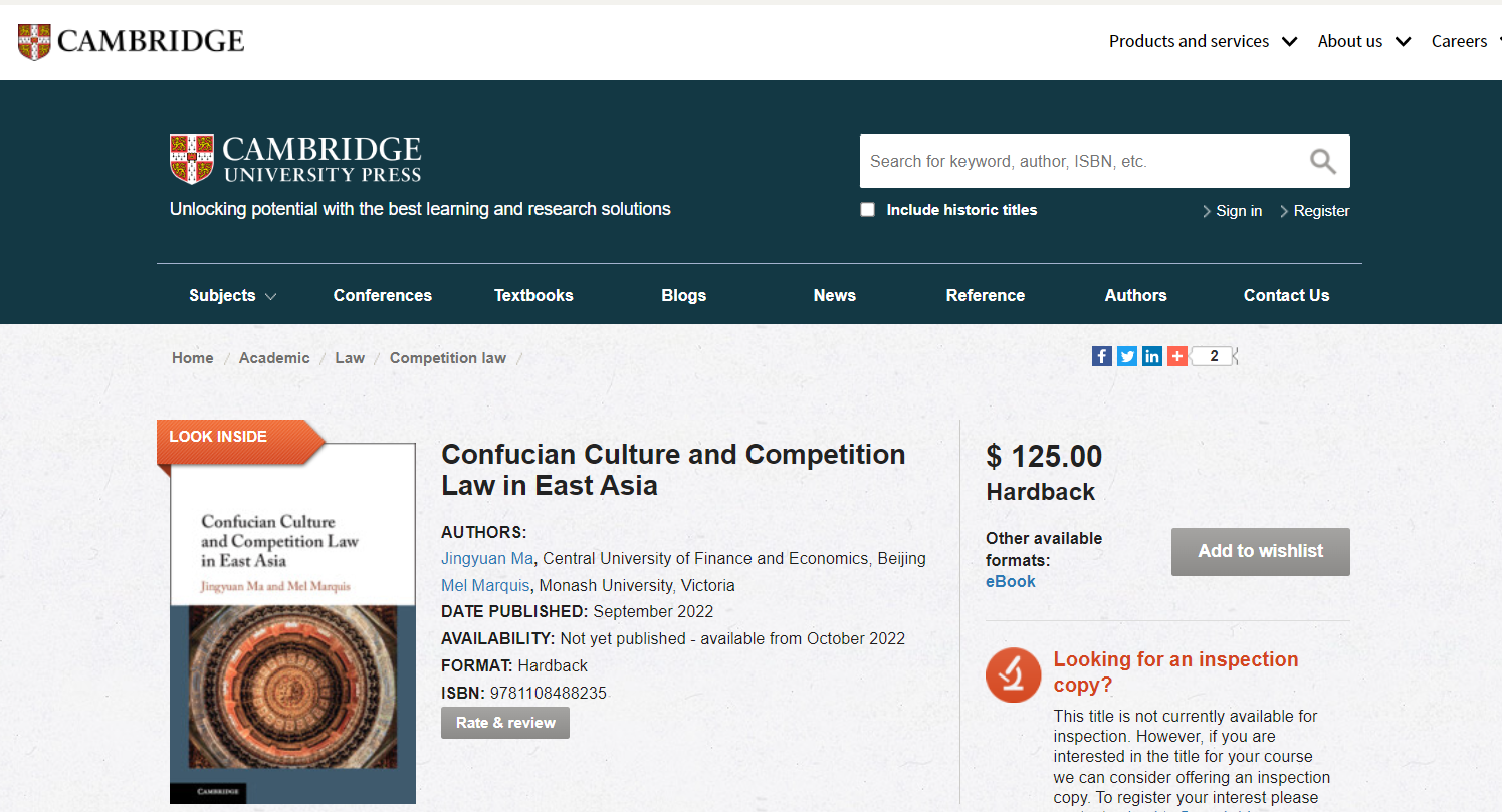 3522vip浦京集团马静远副教授英文学术专著《Confucian Culture and Competition Law in East Asia(儒家文化影响下的东亚反垄断法)》2022年9月由英国剑桥大学出版社出版。3522vip浦京集团马静远副教授为该书第一作者,第二作者是澳大利亚莫纳什大学Mel Marquis教授。该著作也是我校教师在该出版社出版的第一部学术专著。