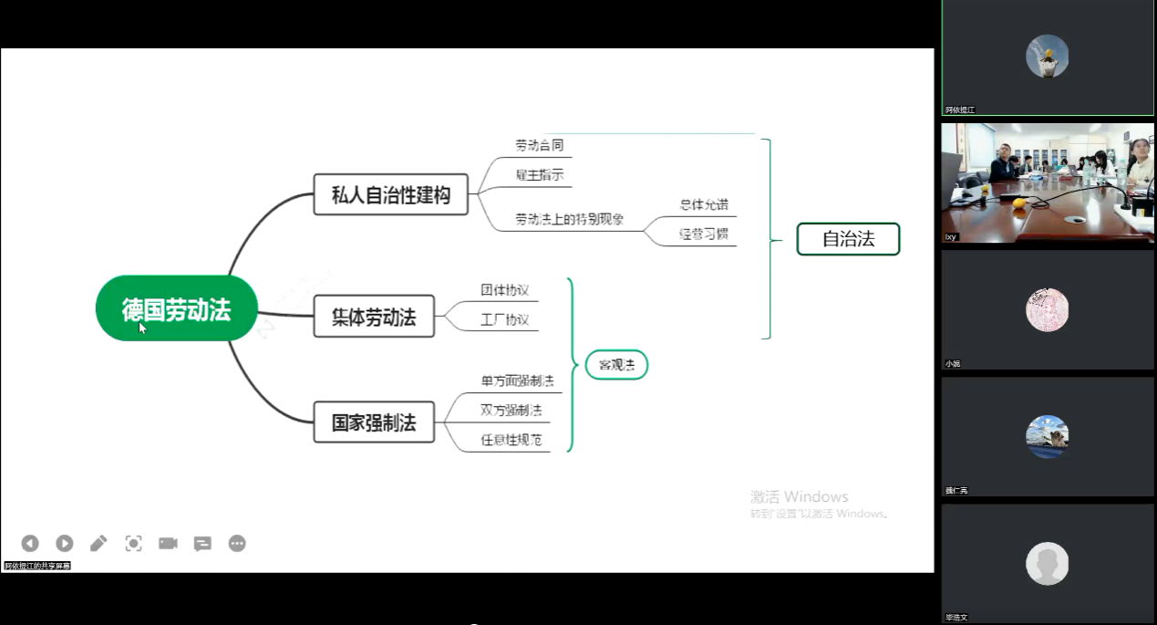 第二单元中,阿依提江同学在线上参与活动,对《德国劳动法》第七章“国内劳动法的法律渊源和建构手段”进行汇报。她在对该章内容整体梳理基础上,将德国劳动法法源的三个层级进行了汇总,结合案例依次介绍了私人自治性建构(劳动合同、总体允诺、工厂习惯)、工厂协议和团体协议以及国家立法的内涵、功能和体系。并就上述请求权基础和规范适用的层级和顺序进行了分析,说明了在不同层次规范之间进行选择时所要关注的规范适用原则。