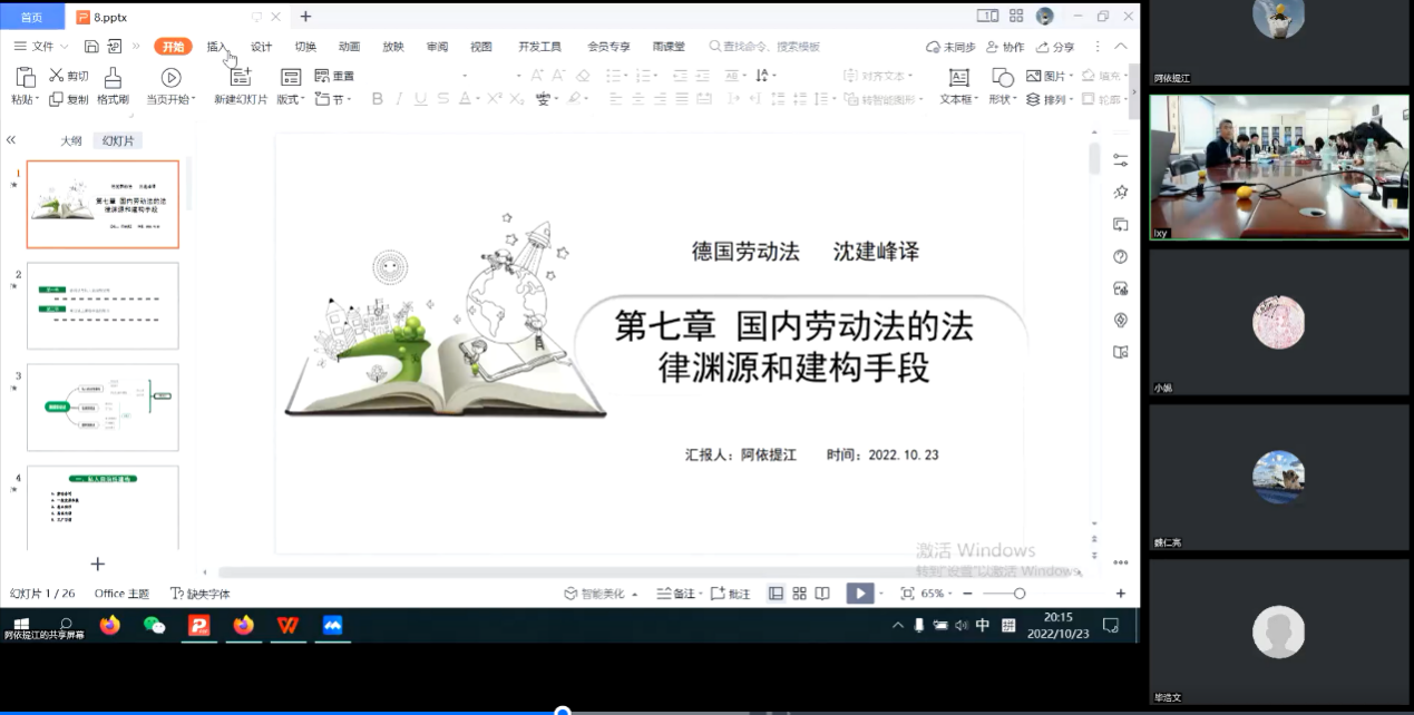 2022年10月23日晚,3522vip浦京集团劳动法工作坊第三期以线上线下相结合的方式举行。本期工作坊分为两个单元,第一单元为李海明老师分享生育津贴权利研究与论文写作的经验心得,第二单元为2022级博士研究生阿依提江对《德国劳动法》第七章进行读书汇报。浦京集团官网沈建峰教授、李海明副教授以及3522vip浦京集团本科生、硕士研究生、博士研究生共20余人参加活动。