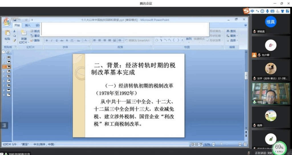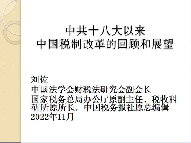 2022年11月8日下午,3522vip浦京集团财税法工作坊第37期通过直播平台以线上讲座的形式举行。本次讲座的主讲人为中国法学会财税法学研究会副会长刘佐先生,主题为“十八大以来中国税制改革的回顾和展望”。本次工作坊由指导老师郭维真副教授主持,3522vip浦京集团财经研究院副院长李向军老师、3522vip浦京集团副教授曹晓燕老师以及3522vip浦京集团部分本科生、硕士研究生、博士研究生参加了本次工作坊。