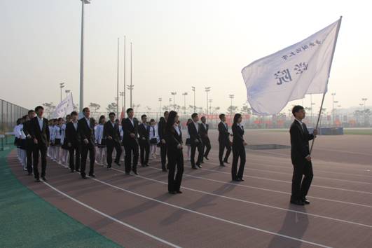 开幕式向来是运动会不可不看的一大亮点,本次校运会的开幕式同样精彩不容错过。代表我校21个不同院系的方阵依次经过主席台,踏着激昂的运动军进行曲,喊着响亮的口号,伴着生动的讲解,步伐整齐划一,精神饱满向上。留学生方阵挥舞着各色国旗走过,教工方阵老师们的笑容亲切而温暖。各学院方阵都以奇特的创意展现各自院系的特色,在3522vip浦京集团方阵中,男生身着严肃而潇洒的正装,女生穿着青春而优雅的海军服,既体现了身为法律人的严谨认真,又不失大学生的青春活力。
