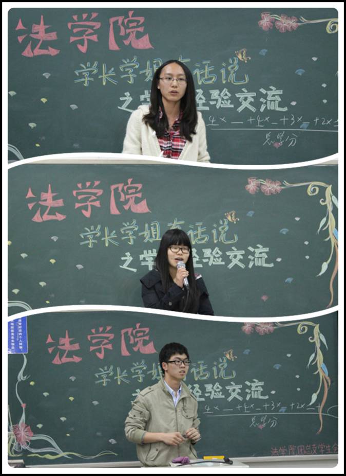 最后上台发言的是2011级许婉霞同学。许婉霞同学成绩优秀,获得包括国家奖学金在内的多类奖学金。对于法学专业课的学习,许婉霞同学告诫同学们应当抓好基础,尤其是法理学和民法总论的部分,将各科学习融会贯通。她建议同学们带着问题看书,在现代信息高速公路的时代背景下,充分利用网络资源,关注如中国法律网、中国法律创新网等法学类网站,以及国内外时事热点等,扩展自我的见识面与知识面,全方面提高自己的法律素养,成为一名现代社会亟需的卓越法律人才。