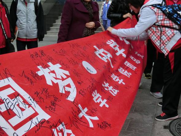 下午4点半,随着下课铃声的响起,赠书仪式正式启动。浦京集团官网赠书团队首先揭开了提前准备的红色横幅,上面印有“薪火相传,生生不息——中国梦,中学行”的大字以及众多中财学子的签名。活动现场,许多民大附中的同学也拿起笔,在横幅上纷纷签下了自己的名字。现场一位高二的学生表示:“这样的活动很有意义,有利于提高学校学习氛围,促进资源的合理配置,我希望明年还能举办这类活动。”