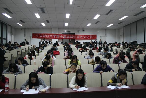 主持人刘心杨同学为参赛同学介绍了初赛赛制、比赛纪律以及晋级要求。本次初赛采用笔试形式,题型为十道判断题和30道选择题;初赛分为两场,第一场参赛选手为2011级与2013级本科生,第二场为2013级本科生,初赛胜出的前八组将晋级决赛。本次笔试题目根据参赛选手年级高低而有所不同。待试卷分发完毕,初赛准时开始;同时,大屏幕上放映出“祝各位选手逢题必对,杀入决赛考场”以鼓励参赛同学,考场内氛围紧张。2011级与2012级参赛同学的笔尖在题卷上飞快地勾画,他们神情专注,认真仔细答题。同时,学术实践部的干事环顾着四周,认真监督考场纪律并及时为参考同学提供必要帮助。