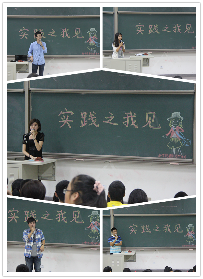 本次暑假实践经验交流会在同学们热烈的掌声中圆满结束。本次交流会不仅给2013年新生们展示了大学丰富多彩的暑假实践,加强了2013级新生与2011级、2012级同学的沟通交流,也使得同学们对法学学习充满了憧憬和激情。