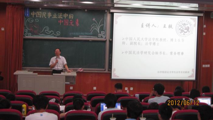 本次讲座的主题是“中国民事立法中的中国元素”,王教授先浅谈中国历史并由此分析讲解了中国民法立法发展的曲折过程,之后王教授又逐条介绍了各个国家的法律对中国民法立法领域内的借鉴和影响。王教授旁征博引,引经据典,其渊博的学识博得了在场同学由衷的敬佩。王教授高度评价了《侵权责任法》,指出该法包含很多中国元素,带有鲜明的中国特色,世界很少有国家制定专门的侵权责任法或在民法中有单独的关于侵权责任的详细内容。王教授深入浅出的讲解、幽默风趣的语风使观众席上时时爆发出雷鸣般的掌声。