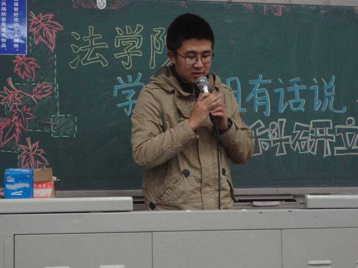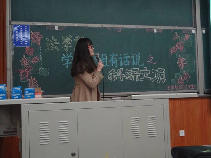 接下来发言的是来自2011级的宋亦淼同学。她曾做过多个科研项目并获得国家重点项目,也曾发表过科研论文。其后,宋亦淼同学分类介绍了她在过去两年所参加的活动。第一类是例如“模拟联合国”和“模拟法庭”之类的学术类科研项目,并着重向我们介绍了撰写法学论文必备的相关知识,也向大家推荐了一些著名的法学刊物。第二类是例如公益类的“友邦”,通过在团队奉献来提高自我。第三类是党团类的科研项目,以此提高政治认识与素养。发言最后,宋亦淼同学以自己的亲身经历鼓励大家要以平和、平淡的心态做科研。
