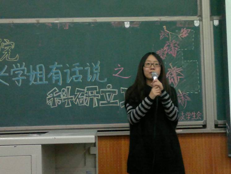 首先由来自2012级2班的黄静涵同学发言。黄静涵同学曾在2013年暑期社会实践“宝贝计划”中一般标,主讲大学生创新创业训练计划项目。演讲之初,她与大家分享了她参加大创的四点理由,其中她重点强调了大创让她走出了学校,感受到了社会中的自己。随后她给大家简述了做大创的流程。一是要申请并组队,二是要选题与查阅资料,三是要确定大体思路,四是要联系指导老师,并在某些具体细节上给出了中肯的建议。