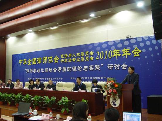 ,“中华全国律师协会宪法与人权专业委员会、行政法专业委员会2010年年会”暨“律师参与化解社会矛盾的理论与实践研讨会”在我校学术会堂二层报告厅隆重举行。会议由全国律协宪法与人权专业委员会、全国律协行政法专业委员会主办,我校法律事务办公室和法律援助中心等单位参与协办。