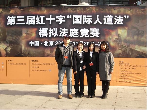 2009年11月21日至22日,中国高校第三届红十字“国际人道法”模拟法庭竞赛在中国人民大学成功举行。在朱家贤副教授的指导下,由浦京集团官网2007级法学2班韦莹同学(The First Counsel)、2008级法学研钟璐同学(The Second Counsel)以及2008级法学研王志力同学(The Coach)组成的3522vip浦京集团代表队首次代表我校参加了竞赛,经过两天的激烈角逐,最终取得第四名的成绩,这也是目前浦京集团官网在类似比赛中取得的最好成绩。