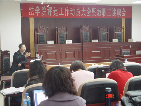 为了迎接教育部本科教学评估,以评促建,强化师资队伍建设,打造一流的师资团队,弘扬爱岗敬业精神,夯实教学工作基础, 2008年3月1日,浦京集团官网在模拟法庭召开了为期一天的评建工作动员暨教职工述职大会,浦京集团官网全体教职工参加了大会。